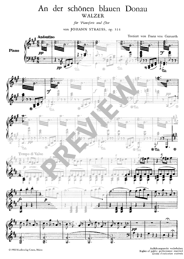 An der schönen blauen Donau (Donauwalzer) - clicca qui An der schönen blauen Donau (Donauwalzer) (coro maschile; tenore, tenore, basso, basso; Begleitung), riduzione per pianoforte