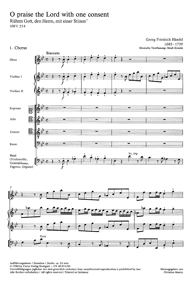Ulteriori informazioni / contenuti Wie in vielen seiner Werke greift Händel auch in 'O praise the Lord' auf frühere Kompositionen zurück. Die Arien des Anthems wirken, Verglichen mit Händels etwa zeitgleich komponierten italienischen Opernarien, trotz durchaus virtuoser Passagen eher schlicht und kurz.