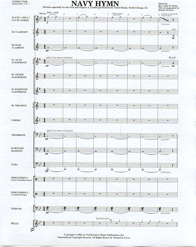 Ulteriori informazioni / contenuti An easy arrangement of this beautiful hymn for the United States Navy. Add this patriotic tune to your young band concert. The 1st clarinets cross the break and the 1st trumpet's highest note is D.