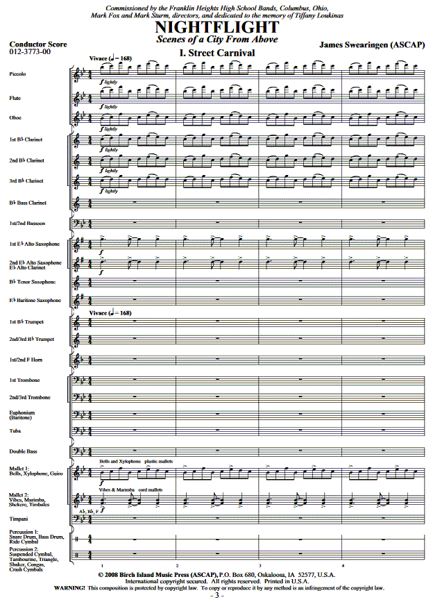 "Nightflight (Scenes of a City from Above)" di James Swearingen è un nuovo accattivante lavoro per banda da concerto, ispirato durante il volo del compositore su Miami. In questo pezzo significativo e creativo, tre scene distintive della città sono rappresentate musicalmente, catturandone la diversità, l'energia e la bellezza.