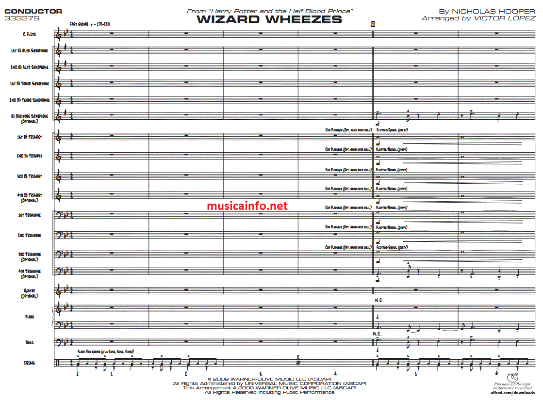 Ulteriori informazioni / contenuti La magia di Harry Potter arriva nella sezione jazz! Questo arrangiamento per big band è un omaggio al negozio di scherzi preferito di Harry, i Tiri Vispi. Traccia bonus nella colonna sonora del sesto film: regalate al vostro ensemble jazz questo swingante arrangiamento di Victor López.