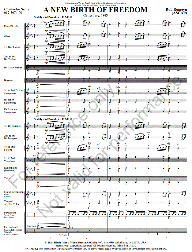 Ulteriori informazioni / contenuti Il genio oratorio di Abraham Lincoln cambiò il corso della storia con il discorso di Gettysburg. "A New Birth of Freedom" di Rob Romeyn onora la visione storica di Lincoln per il paese nell'era della ricostruzione post-Guerra civile e si dedica a quella nobile causa. Dopo una breve introduzione, viene presentata una sezione solista rudimentale su un tema che ricorda lo stile musicale di pifferi e tamburi dell'epoca di Lincoln. Questo tema viene sviluppato man mano che la musica si dispiega, costruendosi gradualmente e conducendo a un apice glorioso, potente e drammatico. L'opera passa quindi a una riformulazione di quella stessa sezione di pifferi e tamburi con cui è iniziata, questa volta conducendo a una conclusione riflessiva e contemplativa. Un'opera davvero eccezionale che porterà un tocco di classe e nobiltà a qualsiasi concerto o esibizione al festival!