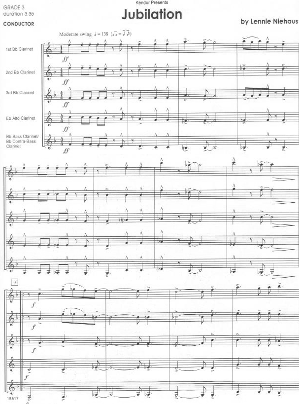Released previously for brass quartets, this scoring for clarinet choirs contains parts for three Bb, alto and bass/contra-bass clarinets, with optional parts for Eb soprano and contra-alto instruments. It is accessible to developing groups, and no one in this swingin' original is consigned to the back seat for the whole ride.